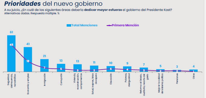 Respecto a las prioridades en las que este nuevo gobierno ha enfatizado, los encuestados definieron que el área a la que se debería dedicar más esfuerzo es la de seguridad, delincuencia y narcotráfico, con un 61%.