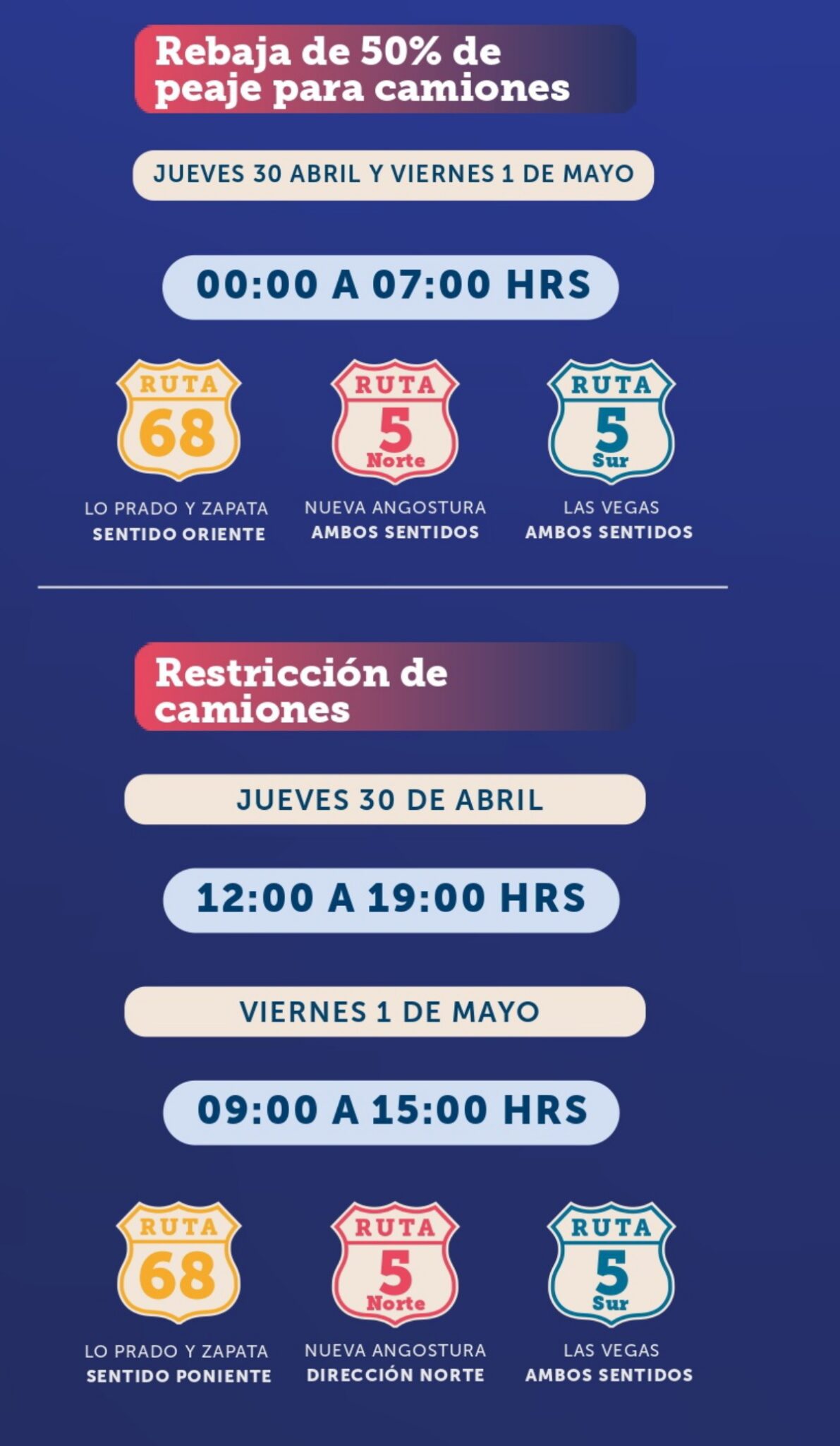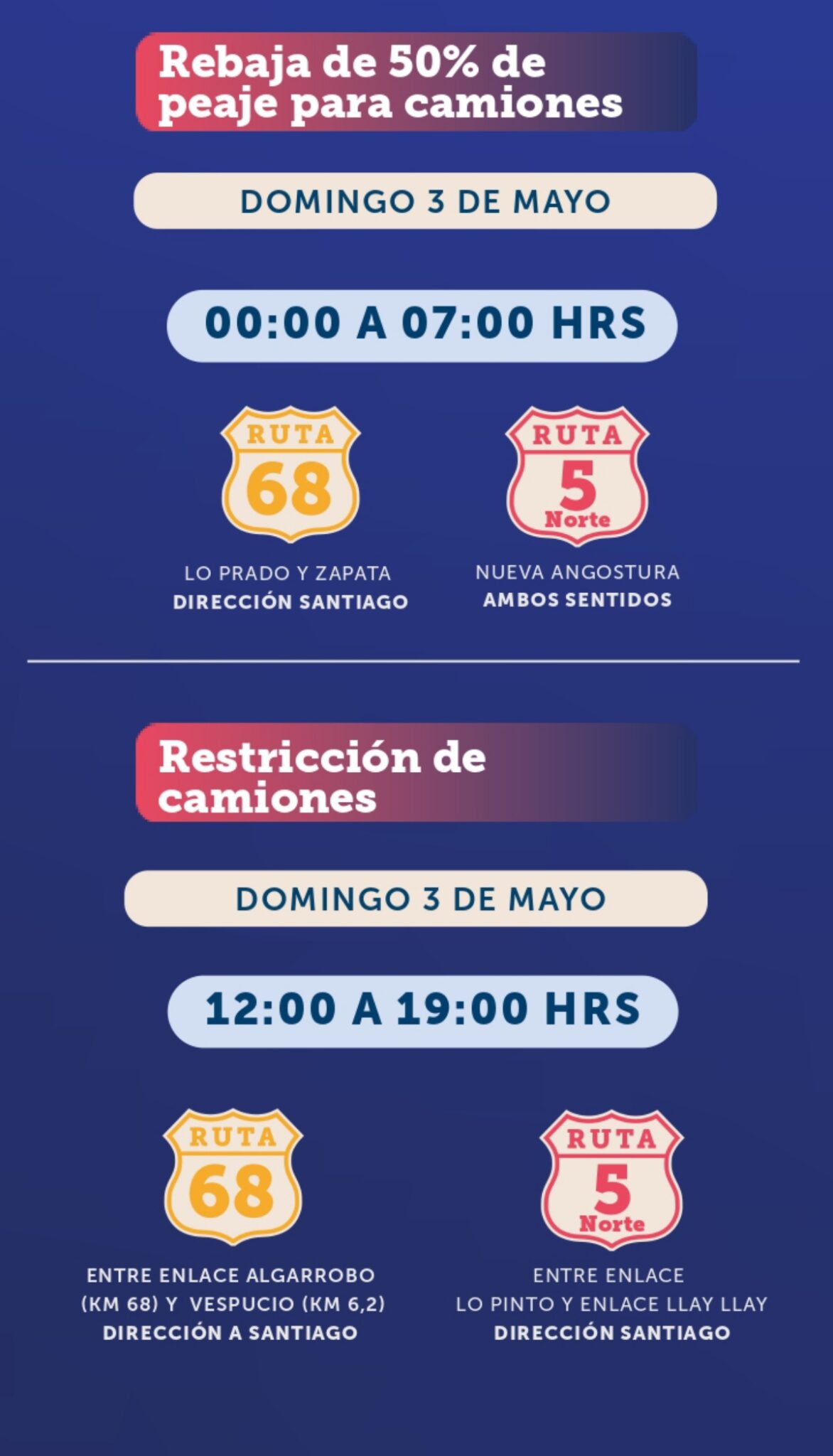 También habrá rebaja de 50% de tarifa en camiones entre las 00:00 y las 7:00 horas del domingo 3 de mayo.