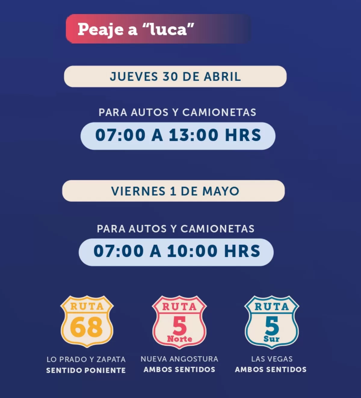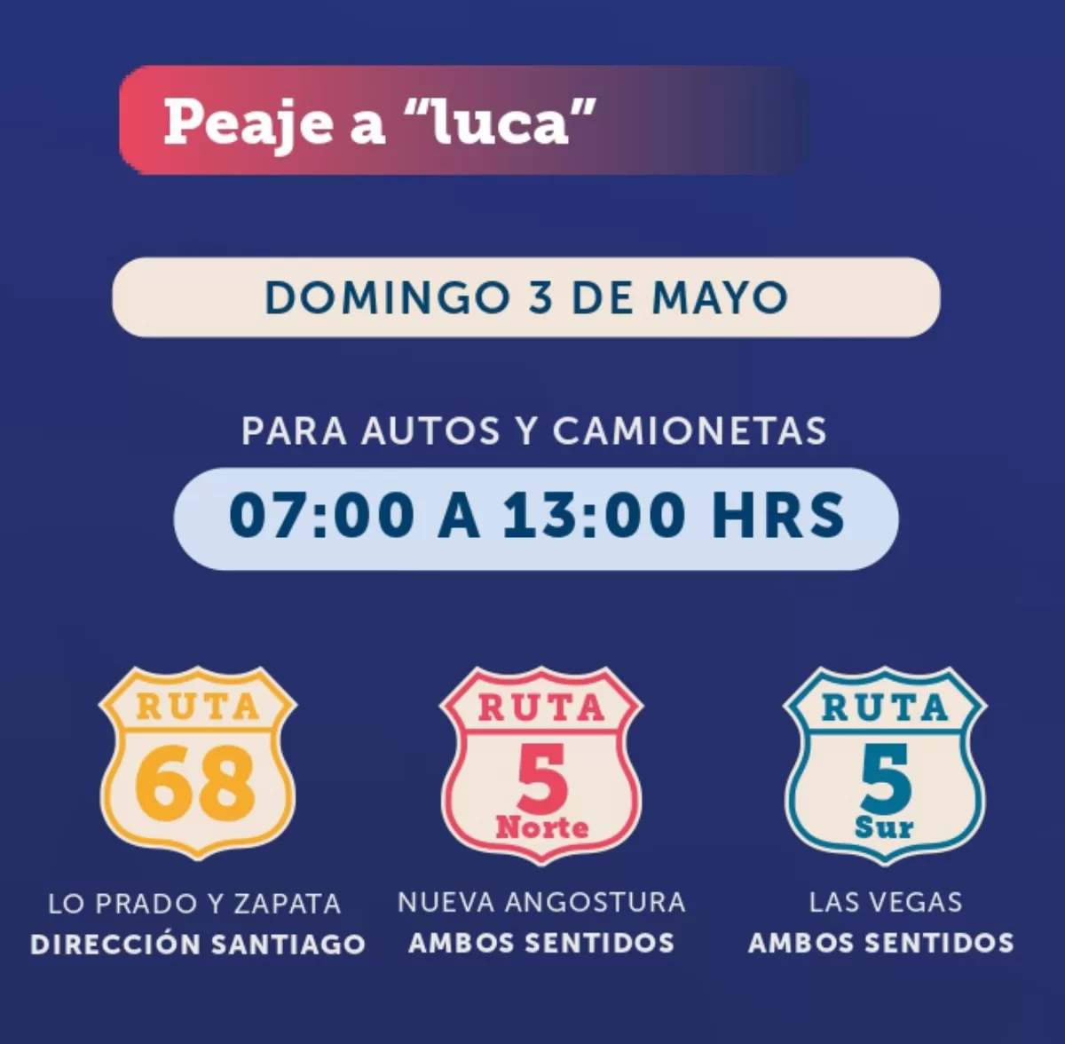 Para el retorno a la capital el “Peaje a Luca” estará disponible desde el domingo 3 de mayo entre las 07:00 hasta las 13:00 horas.