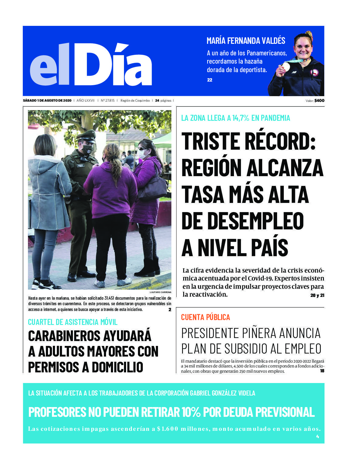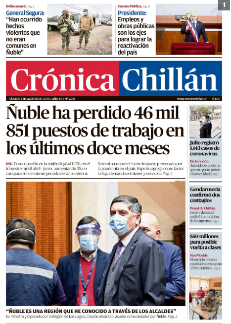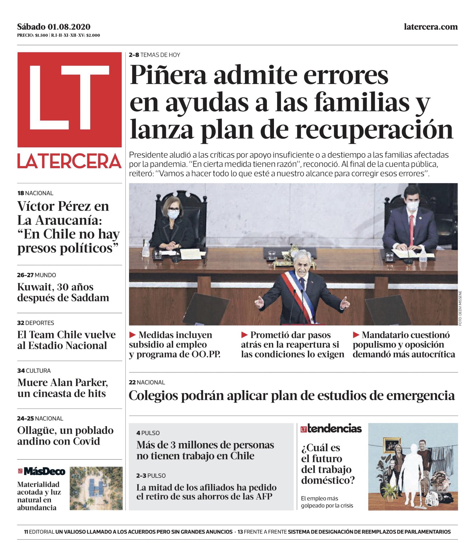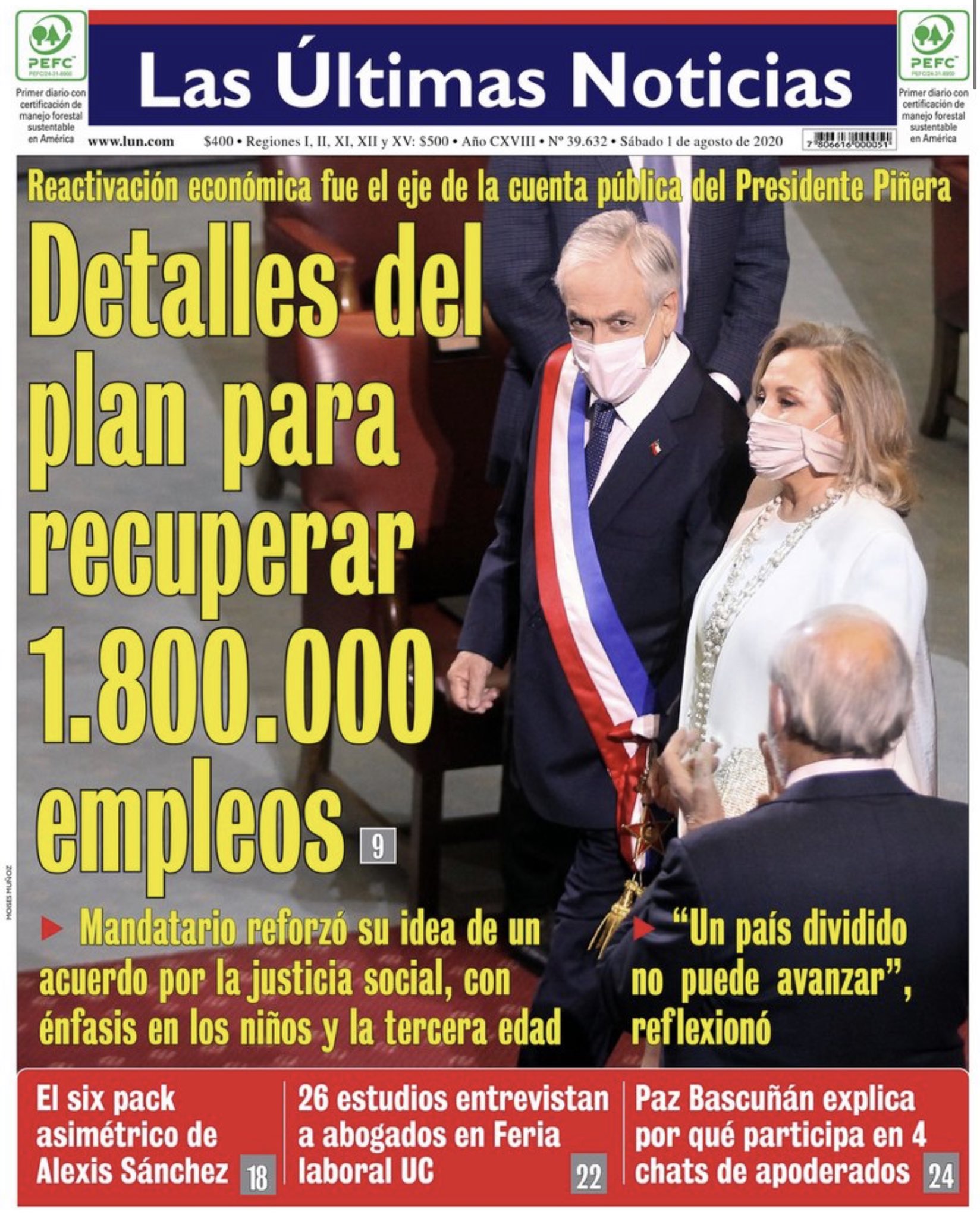 Lee también: Crisis sanitaria, plan de reactivación económica y plebiscito: Las claves de la Cuenta Pública 2020Por lo anterior, diversos diarios nacionales resaltaron este evento en sus portadas para este sábado 1 de agosto.
