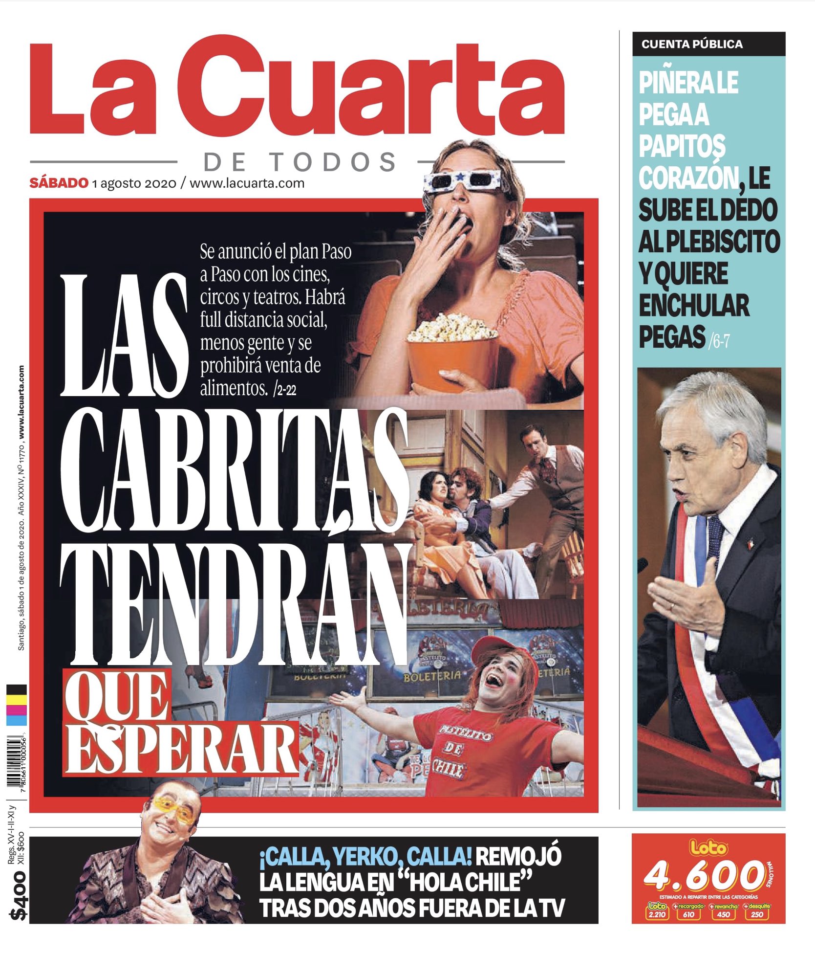 Mientras que La Cuarta, sólo ocupó una pequeña parte de la portada para abarcar la cuenta pública: "Piñera le pega a papitos corazón, le sube el dedo al plebiscito y quiere enchular pegas".