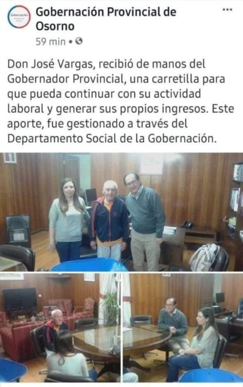 “Don José Vargas recibió de manos del Gobernador Provincial, una carretilla para que pueda continuar con su actividad laboral y generar ingresos propios. Este aporte, fue gestionado a través del Departamento Social de la Gobernación”, escribieron en su cuenta de Facebook.