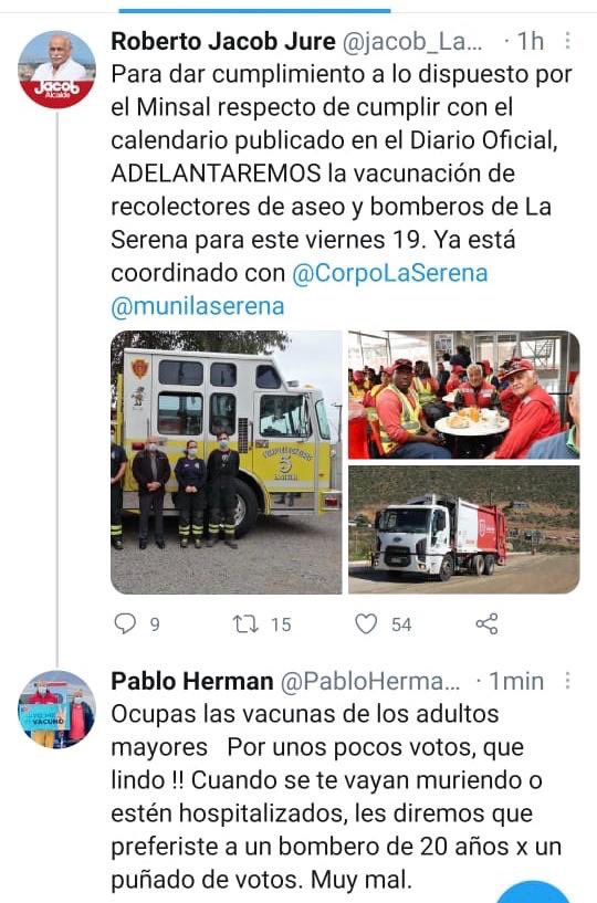 "Ocupas las vacunas de los adultos mayores por unos votos", fue parte del mensaje escrito por medio del Twitter personal de Pablo Herman, el cual aludía al jefe comunal Roberto Jacob. Este domingo, la Intendencia desmintió que fuera publicado por la autoridad regional y culparon al jefe de comunicaciones, siendo despedido de su cargo.