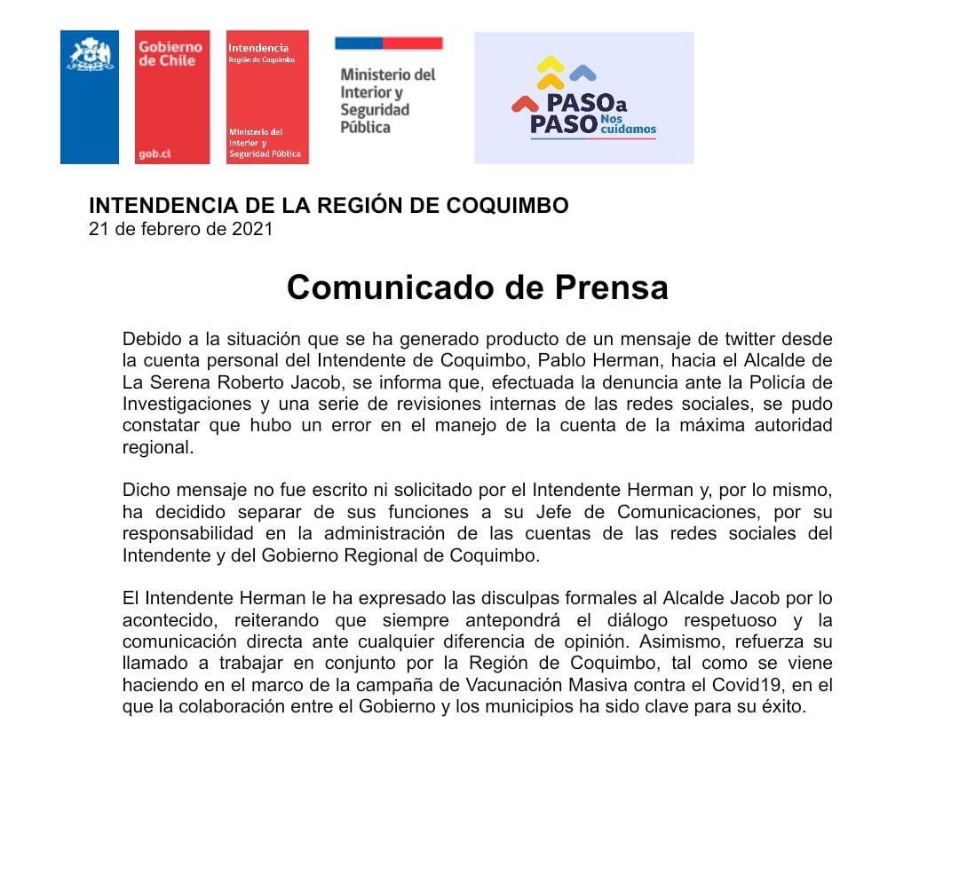 Lee también: Bellolio: "Lo que está ocurriendo los viernes en Plaza Italia es delincuencia""Dicho mensaje no fue escrito ni solicitado por el intendente Herman y, por lo mismo, ha decidido separar de sus funciones a su jefe de Comunicaciones, por su responsabilidad en la administración de las cuentas de las redes sociales del intendente y del Gobierno Regional de Coquimbo", agregó.