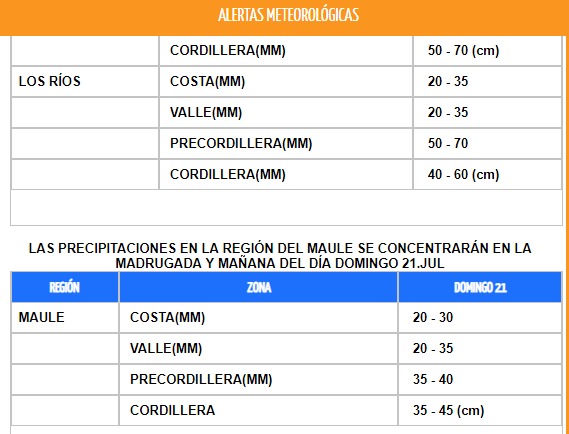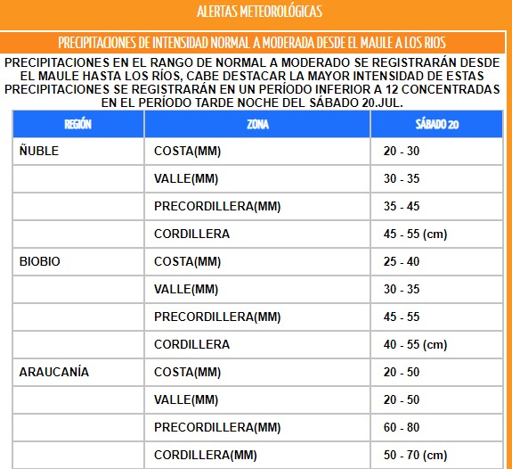 Este sábado (20 julio) recibirán lluvias cuantiosas. Aunque más que el agua, el tema mayor serán los vientos con rachas cercanas a 80 kilómetros por hora entre sectores del Maule y Los Ríos, incluso, podrían superar esa velocidad en lugares de La Araucanía y Los Ríos. Por lo mismo, la Dirección Meteorológica emitió una alerta con la cantidad de agua y nieve que se acumularán durante este evento.