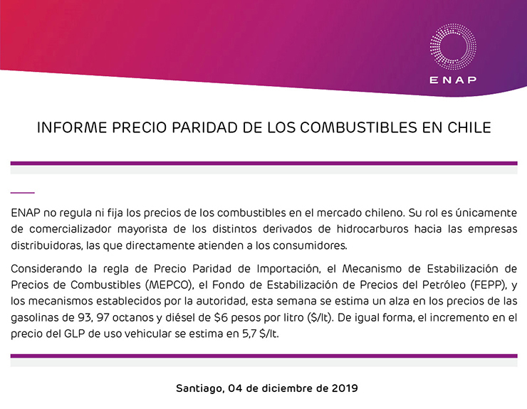 ENAP recalca que "no regula ni fija los precios de los combustibles en el mercado chileno. Su rol es únicamente de comercializador mayorista de los distintos derivados de hidrocarburos hacia las empresas distribuidoras, las que directamente atienden a los consumidores".