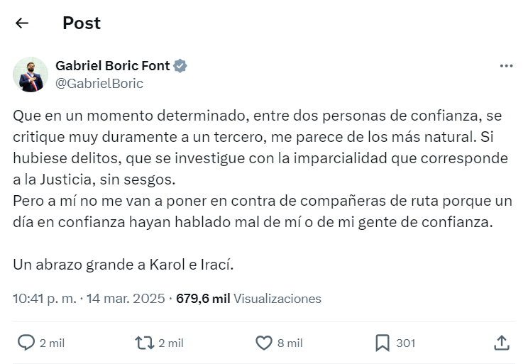 "No me van a poner en contra de compañeras de ruta porque un día, en confianza, hayan hablado mal de mí o de mi gente de confianza. Un abrazo grande a Karol e Irací", cerró Boric.