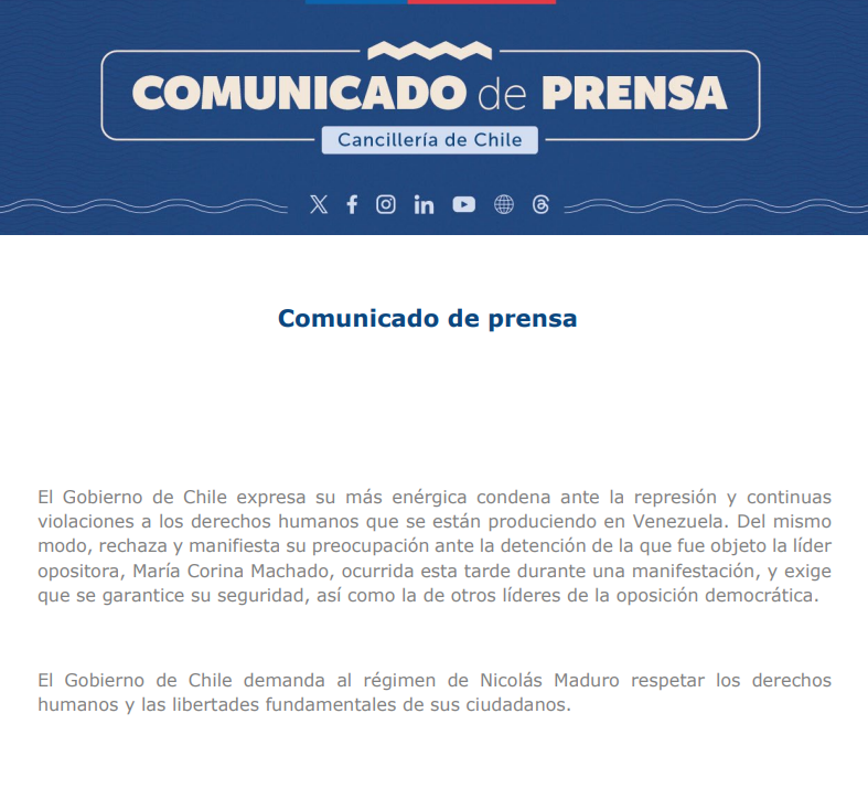 "Hay información de que habría sido detenida, retenida, desconozco en qué condiciones, la dirigente opositora María Corina Machado. Como no tengo los últimos antecedentes, no me puedo referir en detalle a esto, pero sí tengo una certeza: En Venezuela hoy día se está persiguiendo a quienes se oponen al gobierno y el gobierno de Nicolás Maduro se ha convertido en una dictadura" manifestó Boric.