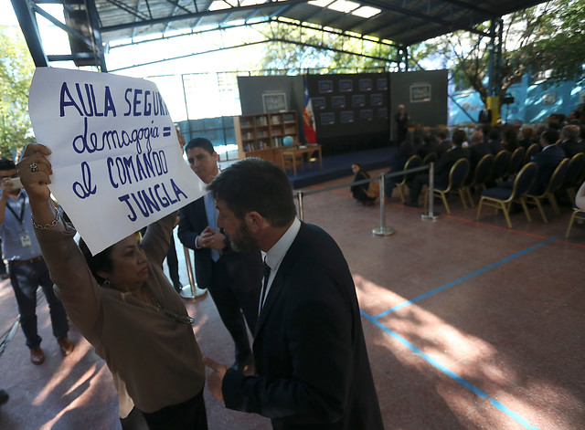 En medio de la ceremonia, una profesora del Liceo Estación Central desplegó un cartel a modo de protesta por la aprobación de esta ley, con el mensaje "Aula segura, demagogia = al Comando Jungla", haciendo referencia al grupo de Carabineros que operaba en la zona de La Araucanía.