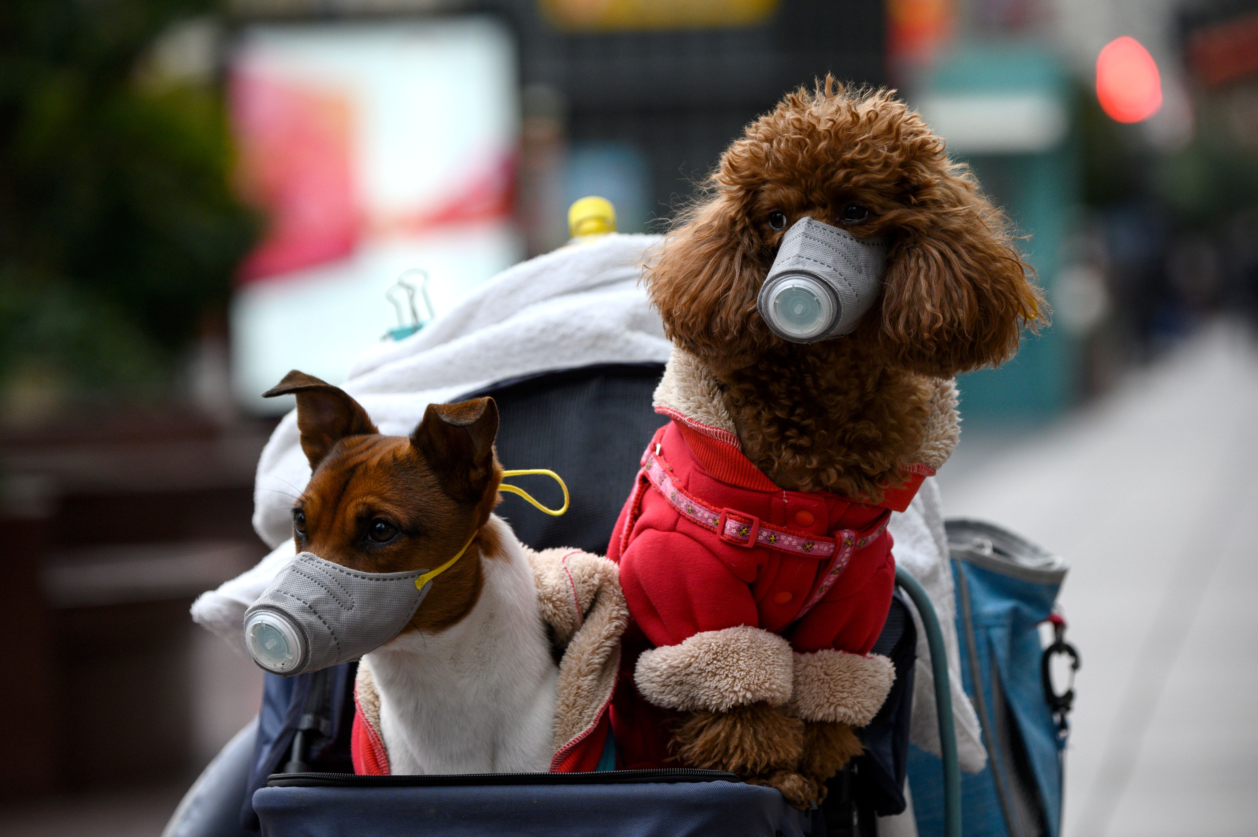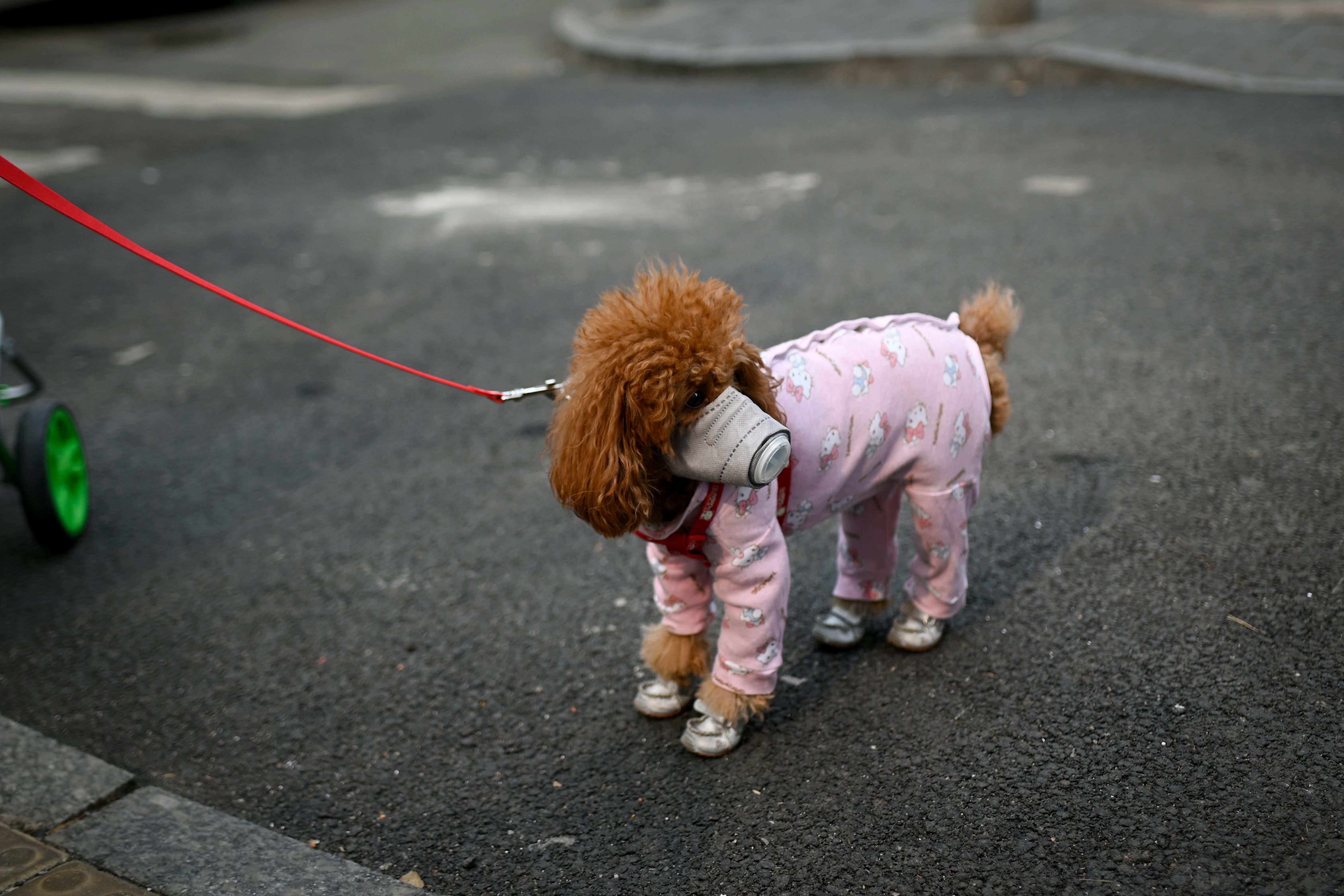 Algunos dueños de mascotas en China continental han puesto a sus perros pequeñas máscaras faciales, pero Gray dijo que eso no tiene ningún beneficio; de hecho, probablemente es bastante angustiante para la mascota y podría causarles pánico.