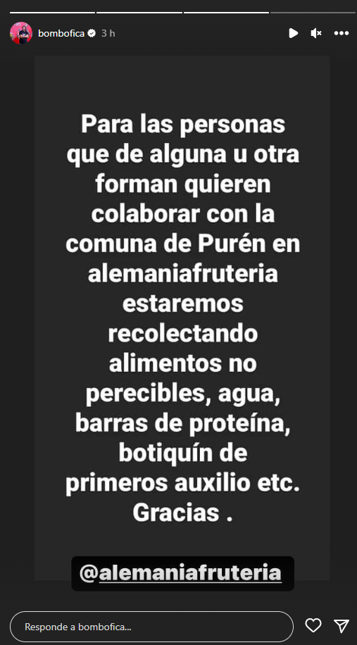 Por su parte, el Bombo, a través de su cuenta oficial de Instagram, compartió algunas historias donde se explica que toda la cooperación llegará "a los distintos albergues, Bomberos, personal de salud". De la misma forma, compartió una publicación donde se lee que "para las personas que de alguna u otra forma quieran ayudar a la comuna de Purén, en Alemania Frutería estaremos recolectando alimentos no perecibles, agua, barra de proteína, botiquín de primeros auxilios, etcétera".🔴 #PURÉN/ ARRANCANDO DE LOS MEDIOS Y REALIZANDO AYUDA ANÓNIMA LLEGA BOMBO FICA A SU TIERRA NATAL.