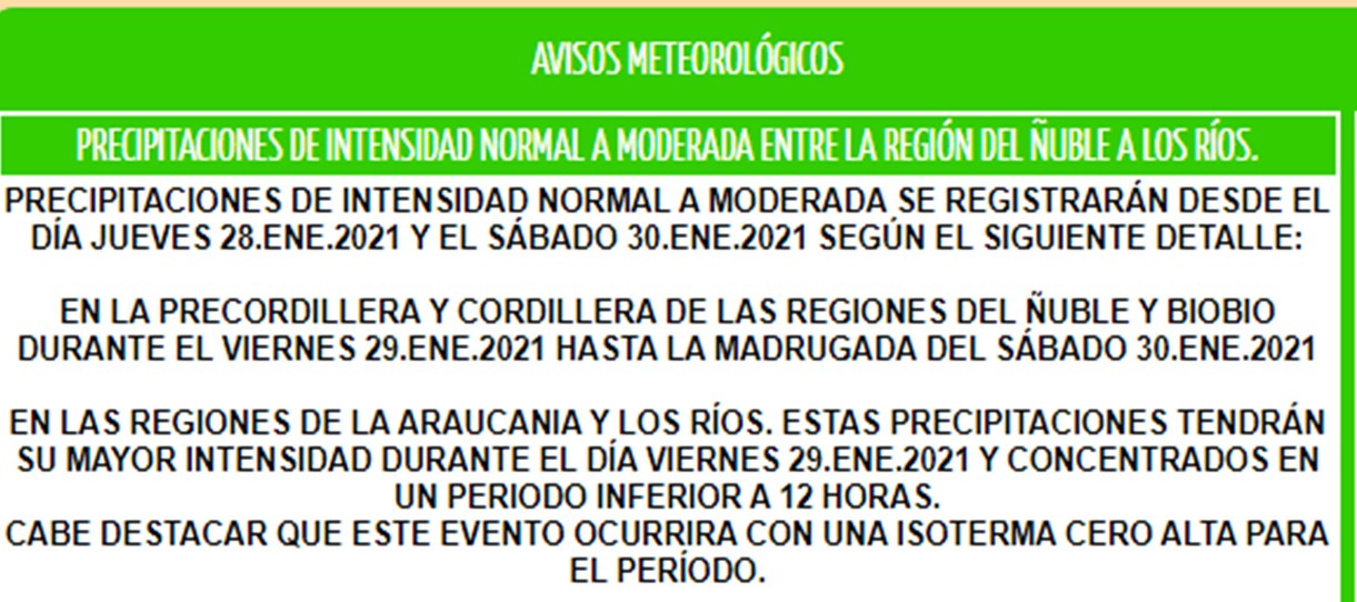 La Dirección Meteorológica de Chile (DMC) emitió un aviso por las “precipitaciones de intensidad normal a moderada (15 - 45 milímetros)”, que afectarán las regiones de Ñuble, Biobío, La Araucanía y Los Ríos a partir de este jueves 28 de enero. Además, con “una isoterma 0 alta” advierten desde el organismo.