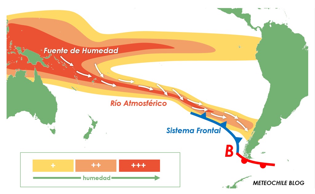 Cuando el vapor de agua, que viajó miles de kilómetros por el océano Pacífico, se conecta con un sistema frontal (baja presión) le aporta a este una gran cantidad de lluvia, la cual puede caer de manera torrencial en un lapso acotado.