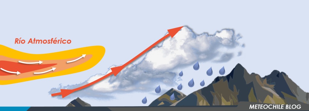 René Garreaud describe que “el efecto más notable de los ríos atmosféricos ocurre cuando arriban a las costas occidentales de los continentes, como el sur de Chile o el oeste de Norte América. En nuestro caso llegan entre 30 y 40 a la costa cada año, con mayor frecuencia entre las regiones del Bío Bío y Aysén. Como el aire debe ascender sobre las montañas de las cordilleras de la Costa y de los Andes, ocurre enfriamiento, condensación del vapor y precipitación. Así, los RA dan cuenta de más del 60% de la precipitación anual en gran parte de Chile”.