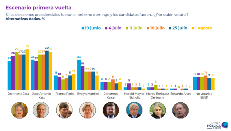 - José Antonio Kast - Mantiene: Continúa liderando las preferencias con 27% en un posible empate técnico con Jara.