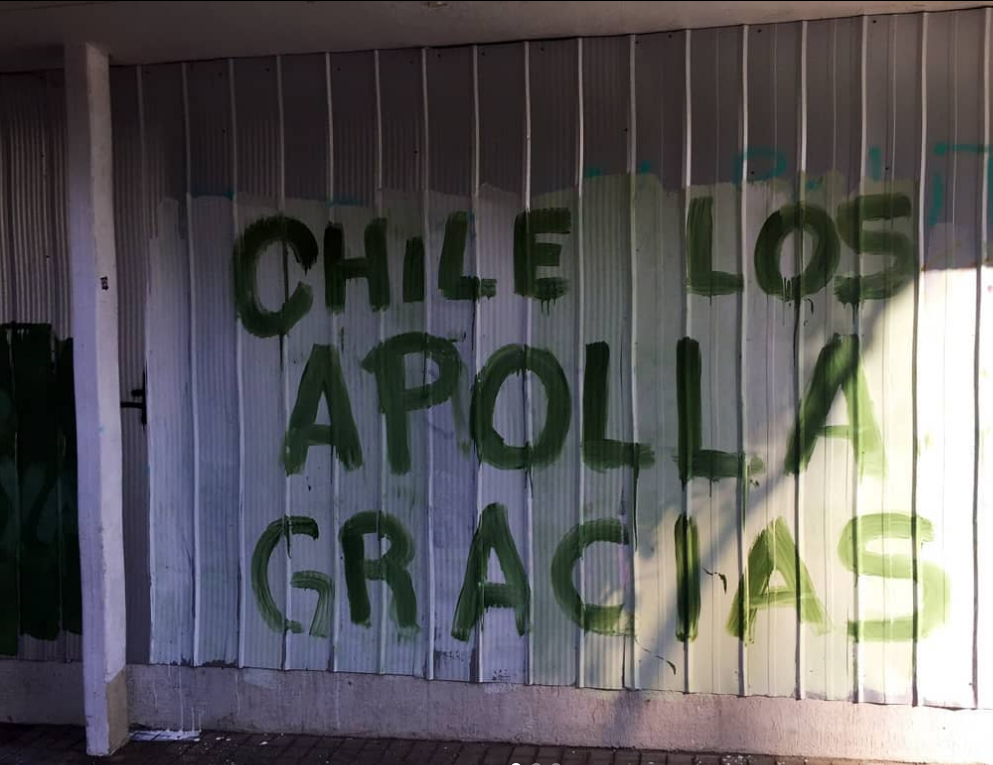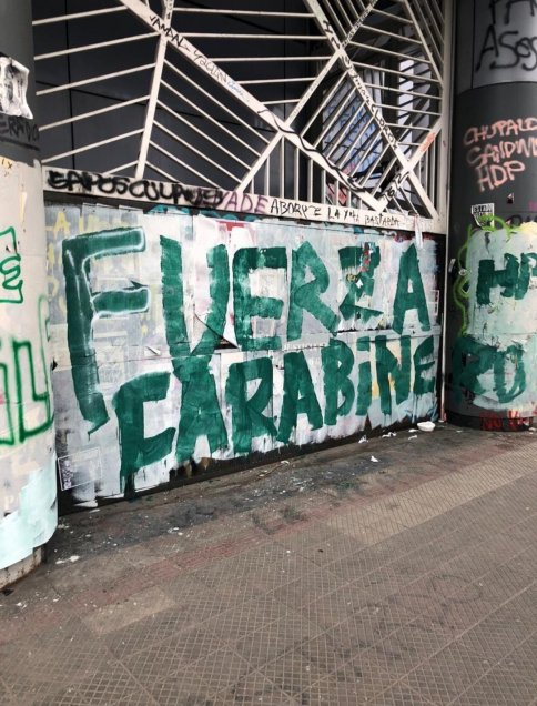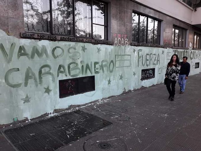 Lee también: Contraloría inicia sumario por carabineros que usaron apodos en sus identificacionesTambién la estatua de Manuel Baquedano apareció pintada y las paredes aledañas al sector se pueden leer frases de agradecimiento a los uniformados como "Fuerza Carabineros" y "Chile los apoya".
