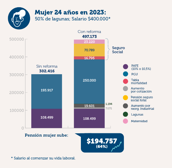 Por ejemplo, en el caso de una mujer de 24 años que en 2023 presenta un 50% de lagunas y recibe un salario de $400 mil, el componente de la maternidad le aporta $23.220.