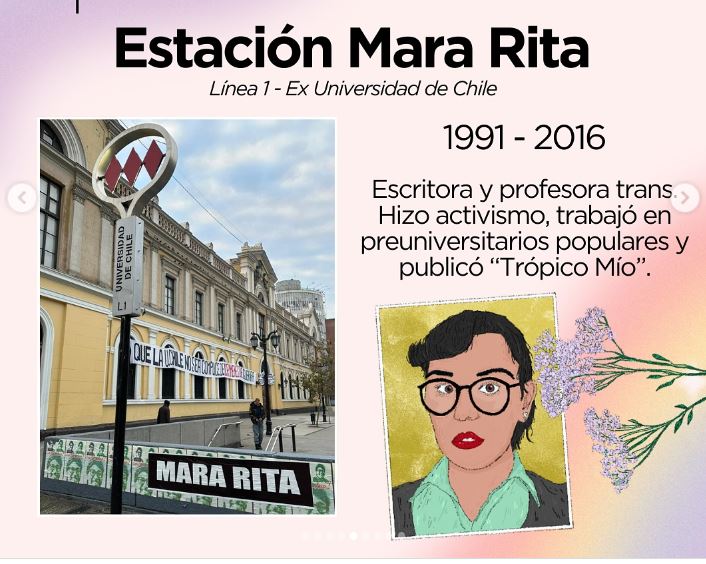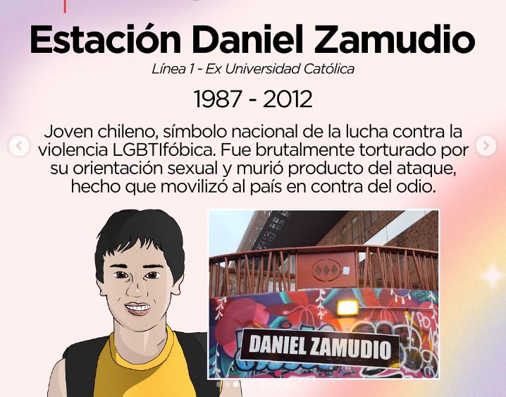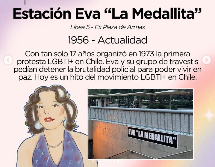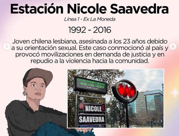 "Se realizó una intervención en siete estaciones, precisamente las que hoy verán pasar la marcha del orgullo, dándoles nuevos nombres. Mónica Briones, Daniel Zamudio, Gabriela Mistral, Mara Rita, Nicole Saavedra, Pedro Lemebel y Eva 'La Medallita' fueron nuestros referentes elegidos para representarnos en esta oportunidad", detallaron.