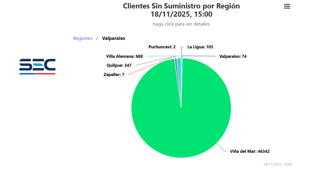 A las 15 horas se actualizó la cifra total, consignando la disminución de clientes afectados, aunque aún superando la cifra de 46 mil en Viña del Mar, principal comuna afectada por el siniestro.