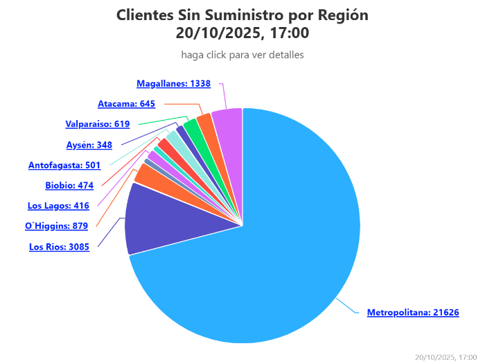 La interrupción del suministro se desarrolla en 26.626 hogares de la región Metropolitana, según el último reporte a las 17:30 horas. Las comunas más afectadas fueron La Florida, Puente Alto y La Granja. A continuación el detalle: