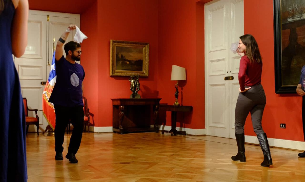 Asimismo, se observa al mandatario practicando el baile típico chileno con su pareja y coordinadora sociocultural de la Presidencia de la República, Irina Karamanos.