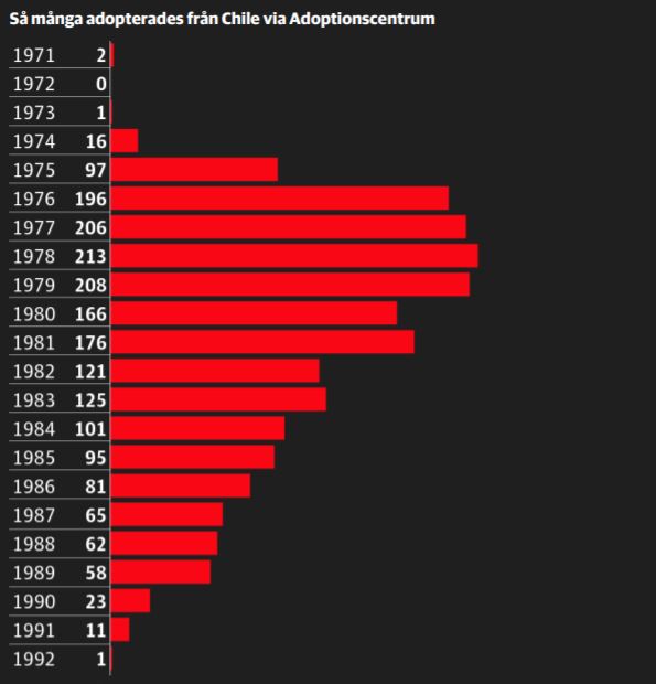 Con respecto a las cifras, el medio Dagens Nyheter contabilizó más de 2100 adopciones presuntamente irregulares. En Chile, desde el año 2018, el juez especialista en Derechos Humanos, Mario Carroza, se encuentra investigando de manera judicial los hechos.