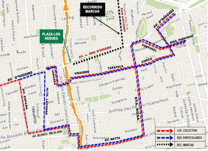 De acuerdo a información oficial, el trayecto será por la Alameda desde la Plaza Los Héroes (en calle Manuel Rodríguez) hasta McIver, finalizando en el Cementerio General.