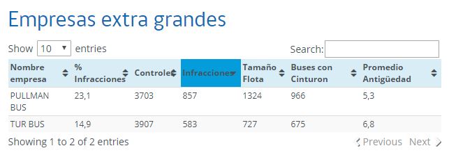 En tanto, la categoría de las empresas extra grandes es compartida por Pullman Bus y Tur Bus. La primera cuenta con una flota de 1.324 buses, de los cuales 966 poseen cinturón de seguridad. Por su parte, la segunda empresa tiene un total de 727 máquinas en circulación y de ellas, 675 tienen cinturón.