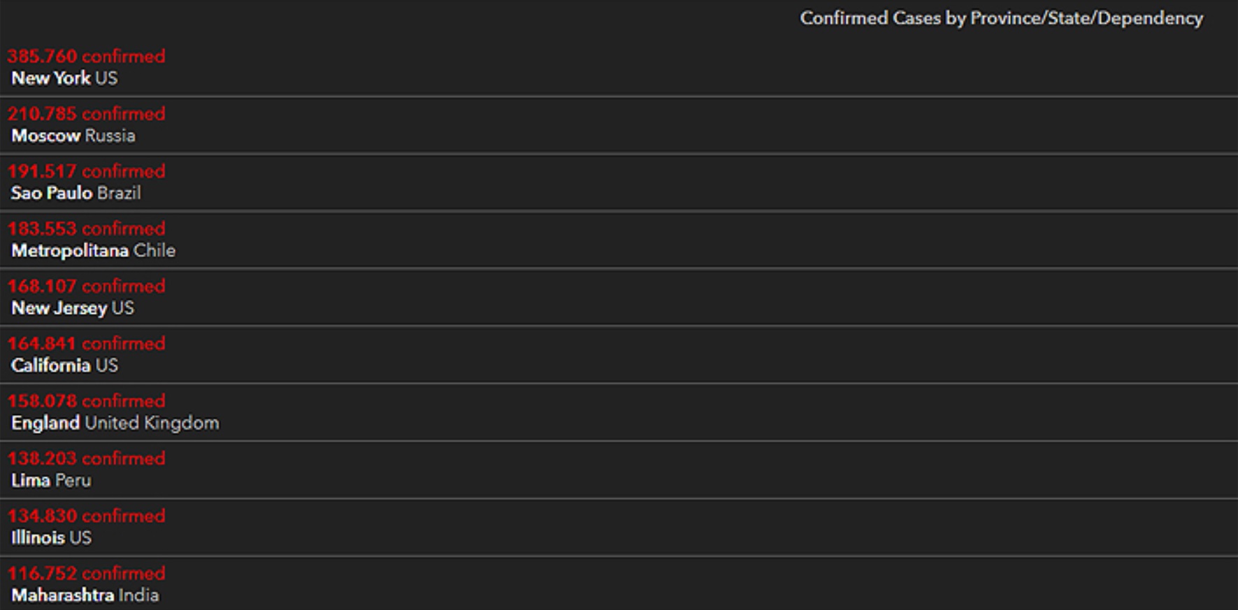 El listado está liderado por grandes ciudades del mundo, entre las que se encuentran Nueva York (Estados Unidos), con 385.760 contagios; Moscú (Rusia), con 210.785 afectados; y en tercer lugar Sao Paulo (Brasil), con 191.517.