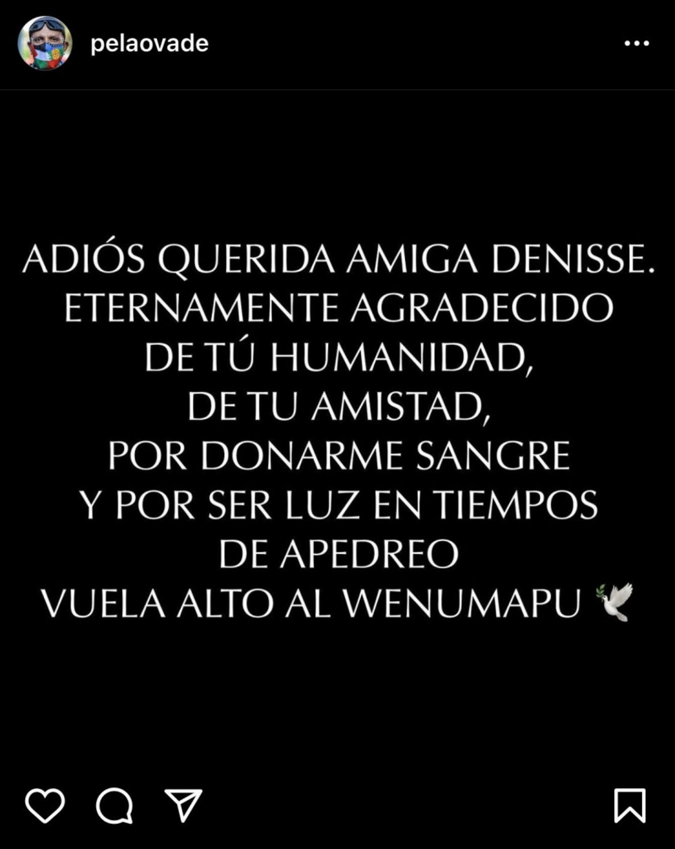 Para partir con sus palabras, Rojas Vade escribió: "Adiós, querida amiga Denisse. Eternamente agradecido de tu humanidad, de tu amistad, por donarme sangre y por ser luz en tiempos de apedreo".