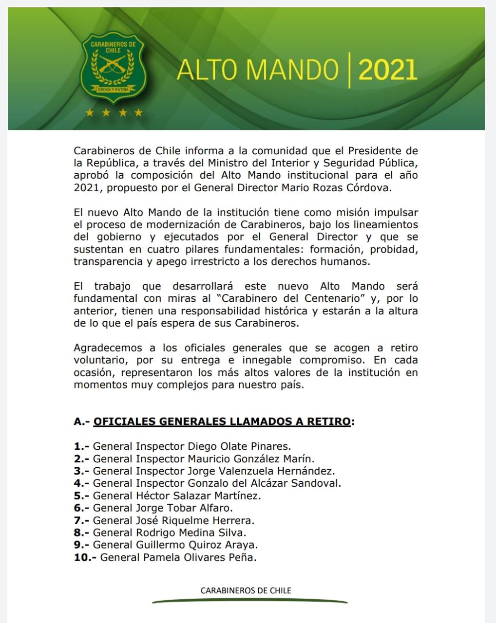 Lee también: Corte Suprema ratificó rechazo a recursos de generales de Carabineros sumariados por ContraloríaEn cambio, el Ejecutivo anunció que otros 12 generales dejarán su cargo. Entre ellos se encuentra Jorge Valenzuela Hernández, quien integra el grupo de uniformados sumariados por el organismo fiscalizador.
