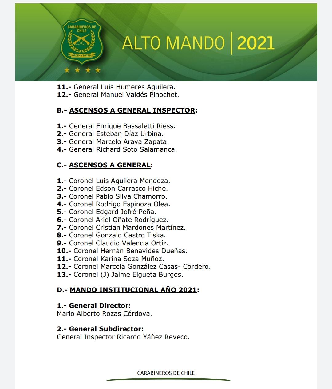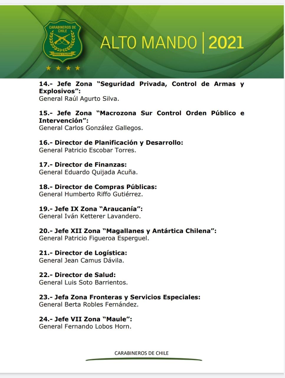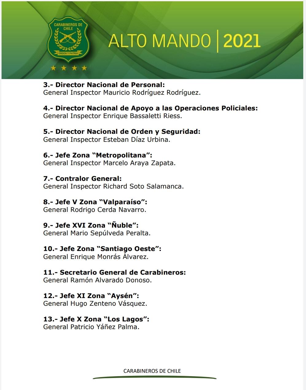 También fueron confirmados otros generales investigados por la Contraloría tras denuncias sobre su responsabilidad de mando en los abusos cometidos por la policía uniformada durante el estallido social.