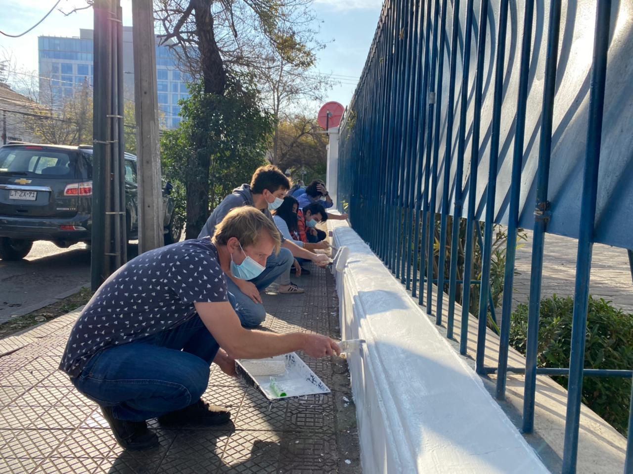 El parlamentario y cerca de una decena de jóvenes acudieron al recinto ubicado en Providencia para pintar nuevamente de blanco el muro perimetral que da a la calle Antonio Varas tras la vandalización de un grupo que participaba de una manifestación de ciclistas, quienes también atacaron el frontis con piedras y fuegos artificiales.