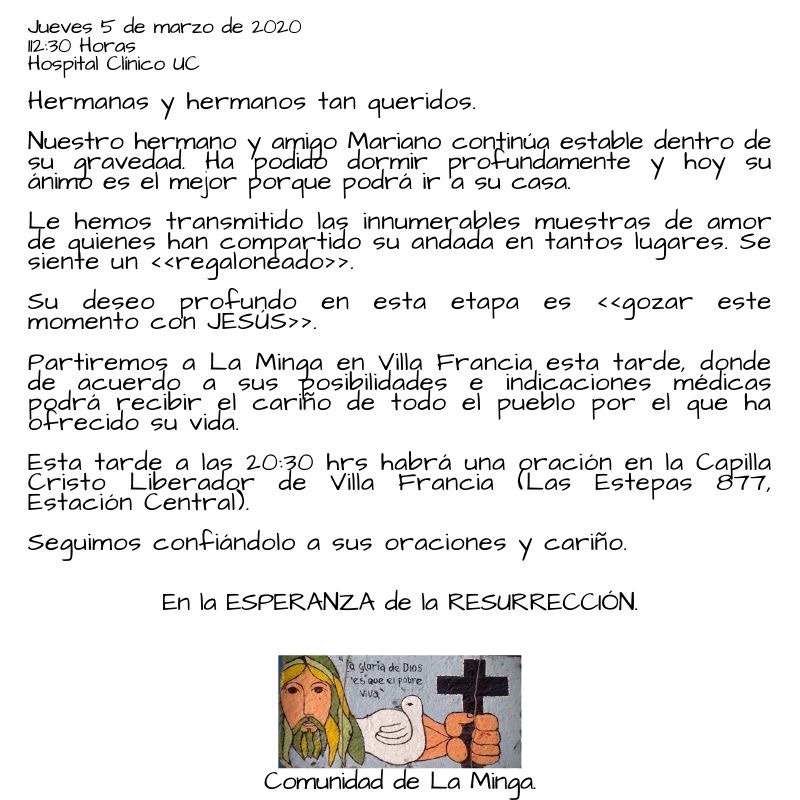 A través de un comunicado la Comunidad La Minga informó que el sacerdote "continúa estable dentro de su gravedad" y que ha podido descansar mientras se permanece internado en el Hospital Clínico UC.