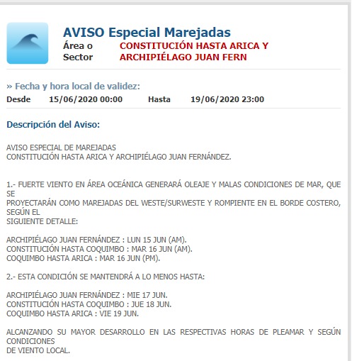 Además, el Servicio Meteorológico de la Armada emitió un aviso por la llegada de un nuevo evento de marejadas a gran parte de la costa nacional.