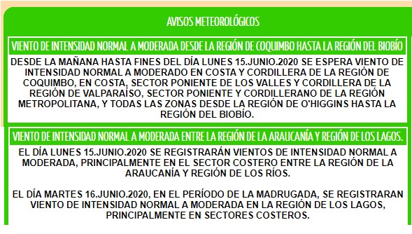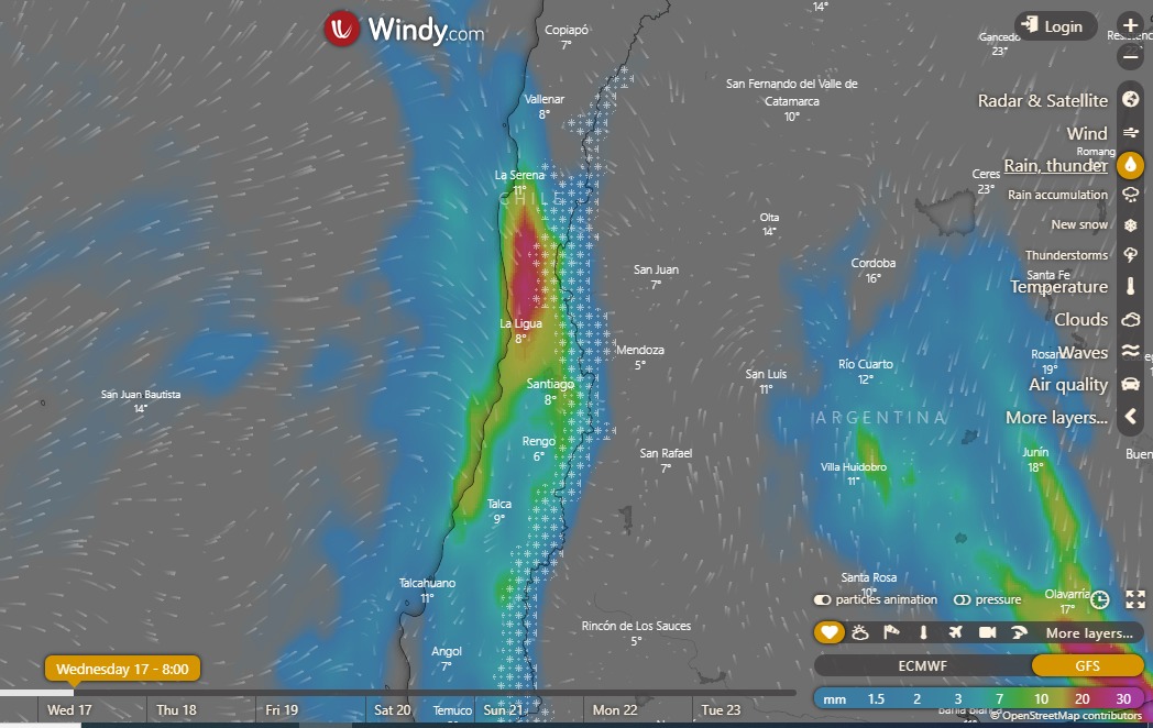 Este lunes soplarán rachas de 70 kilómetros por hora en el centro-sur del país. El miércoles (17 de junio), las precipitaciones alcanzarán Atacama. Ese día lloverá bastante de Coquimbo al Maule, especialmente, en la costa. Santiago podría recibir entre 5 y 15 milímetros.