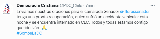 Por otro lado, desde la Democracia Cristiana enviaron sus oraciones y desearon la pronta recuperación del senador. "Todos y todas estamos contigo, querido Iván", expresaron.