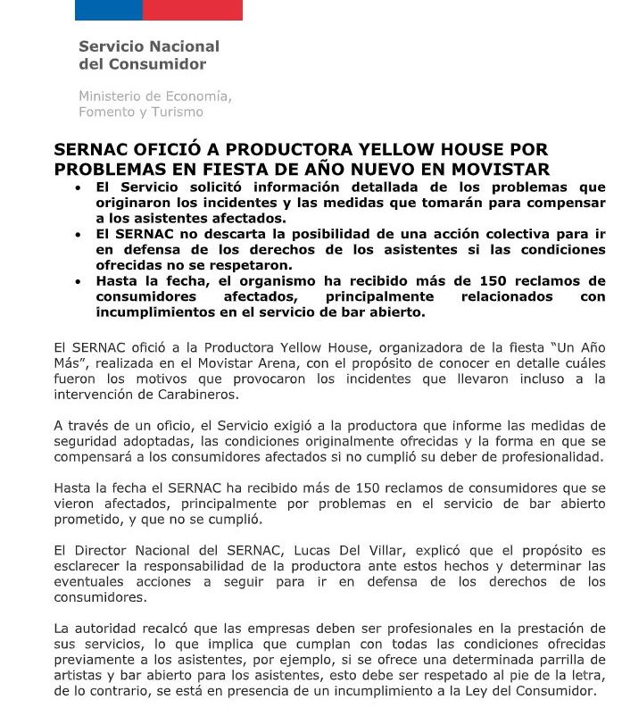 El @SERNAC ofició a productora Yellow House por problemas en fiesta de año nuevo #UnAñoMás en @movistararena 👉🏼 https://t.co/zBjiPKTjh7 pic.twitter.com/uritgDgwDe— Sernac - Chile (@SERNAC) January 2, 2019