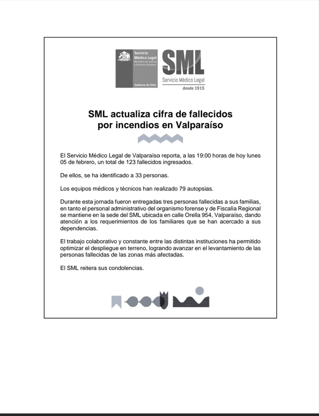 Finalmente, tras la actualización del nuevo informe, el SML reiteró sus condolencias a las familias afectadas.