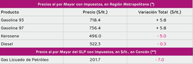 A través de su Informe de Variaciones de Precios de Combustibles, indicaron que, el litro de gasolina de 93 octanos subirá $5,8, alcanzando así un precio de referencia de $718,4, misma alza que sufrirá la gasolina de 97 octanos, que llegará a los 736,4 pesos por litro.