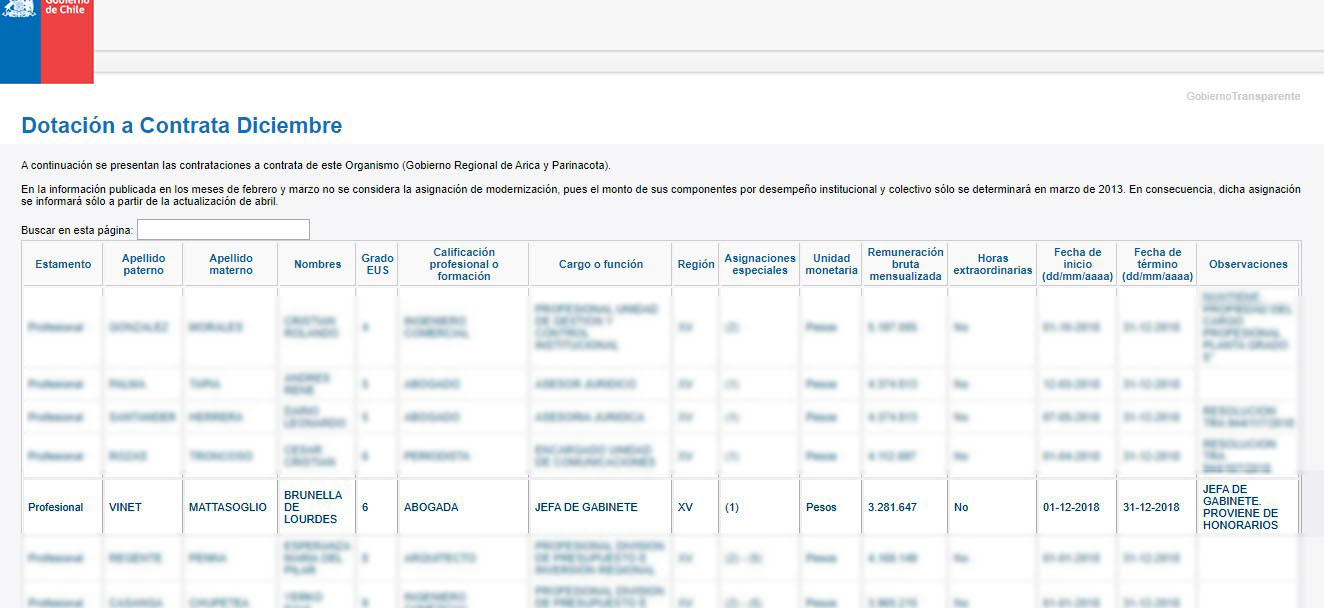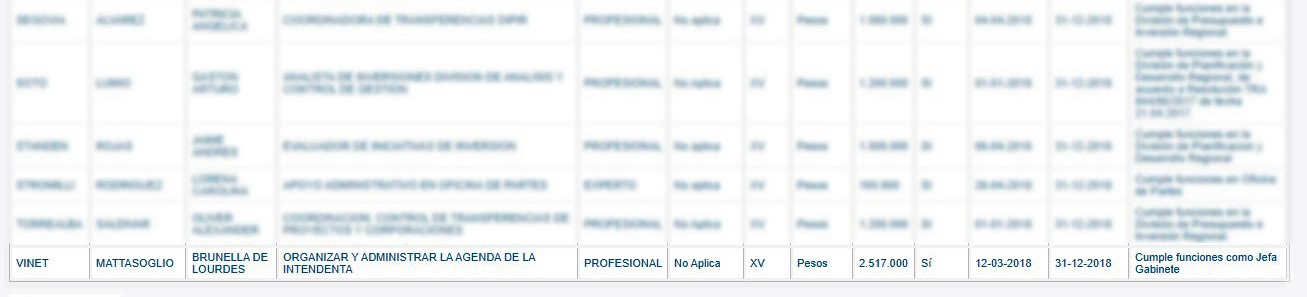 Brunella Vinet se desempeña desde marzo de 2018 como jefa de gabinete en la Intendencia de Arica y Parinacota. Dicha contratación se realizó pese a que Vinet no poseía ningún título al momento del nombramiento ni experiencias previas similares que la hicieran apta para el cargo, y ha incluido aumentos de sueldo reiterados y pagos de cursos en Santiago en desmedro de otros funcionarios.