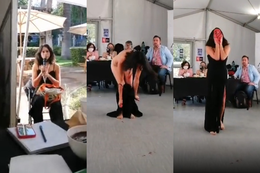 Tras sus palabras, la mujer se roció con una especie de sangre falsa para luego posicionarse al centro del lugar y desnudarse. “¡Nos están secando!, ¡nos están matando!, ¡no lo toleramos más!, ¡nos cansamos!, ¡no vamos a aguantar más que nos maten!”, gritó.