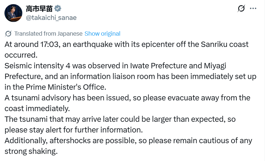 "Por favor, presten mucha atención a la información futura, ya que el tsunami que llegue podría ser mayor de lo esperado. También existe la posibilidad de réplicas. Por favor, continúen atentos a fuertes temblores", señaló la primera ministra japonesa, Sanae Takaichi en su cuenta de X.