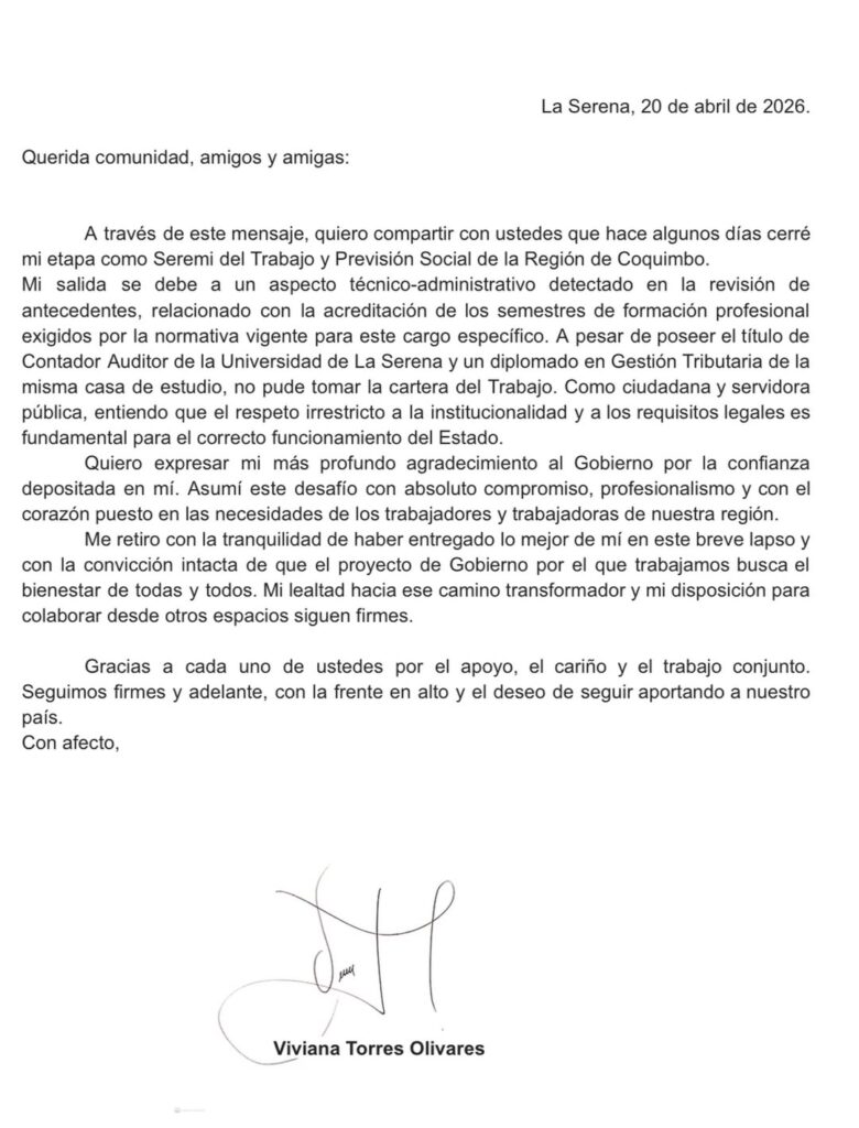 El gobierno sigue sumando renuncias de autoridades en regiones. A través de un comunicado, Viviana Torres anunció su salida como Secretaria Regional Ministerial del Trabajo y Previsión Social en la Región de Coquimbo.