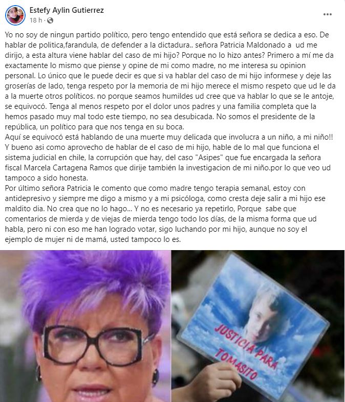 Esta situación provocó la molestia de Estefanía Gutiérrez, madre de Tomás, quien en un extenso comentario en Facebook se dedicó a responderle a Maldonado. "Señora Patricia Maldonado, a usted me dirijo. ¿A esta altura viene hablar del caso de mi hijo? ¿Por qué no lo hizo antes?", expuso.