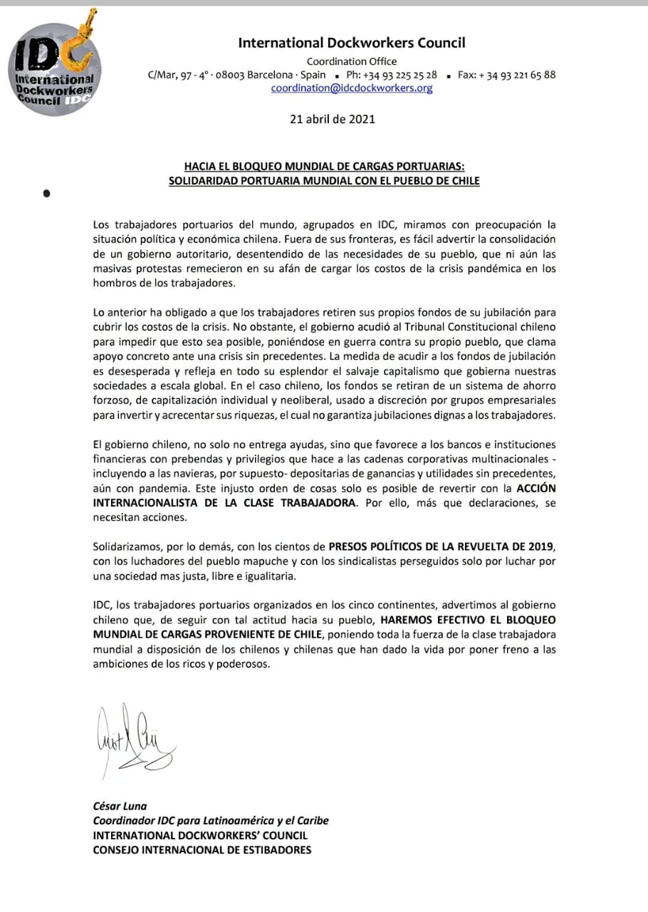 El Consejo Internacional de Estibadores (IDC, por sus siglas en inglés), agrupación que reúne a trabajadores portuarios de distintos países, expresó su preocupación por la situación política y económica en Chile y amenazó con un bloqueo mundial de cargas provenientes de este país.