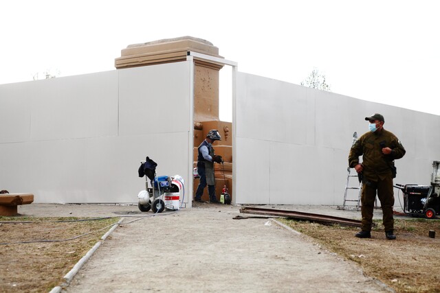Luego de ser retirada la estatua, se continuó el 14 de marzo con el cierre perimetral de la base del monumento y así concretar tareas de diagnóstico, protección y refuerzo al plinto y a la tumba del soldado desconocido.