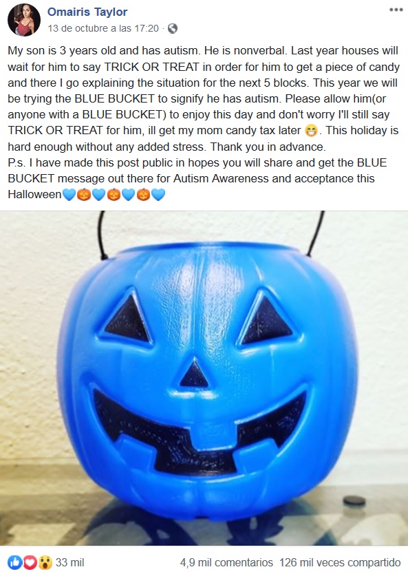 "Por favor permítanle (a él o a cualquier otra persona con la calabaza azul) disfrutar este día y no se preocupen, yo diré 'dulce o truco' por él, tendré mi impuesto de mamá más tarde", dice en una publicación suya en Facebook que se volvió viral.