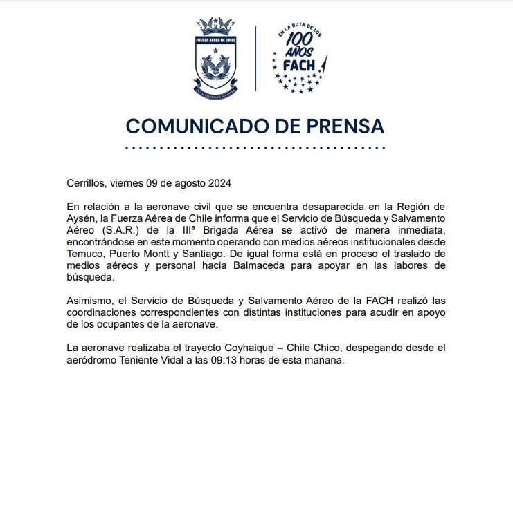 Dicha aeronave despegó a las 09:13 horas desde el aeródromo de Coyhaique a Chile Chico.