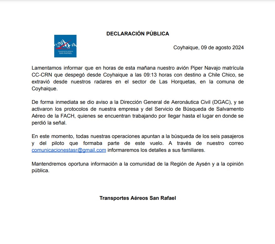 Según informaron las autoridades, en horas de la mañana de esta jornada se perdió el contacto con la aeronave Piper Navajo matrícula CC-CRN, que era operada por la empresa Transportes Aéreos San Rafael Ltda.
